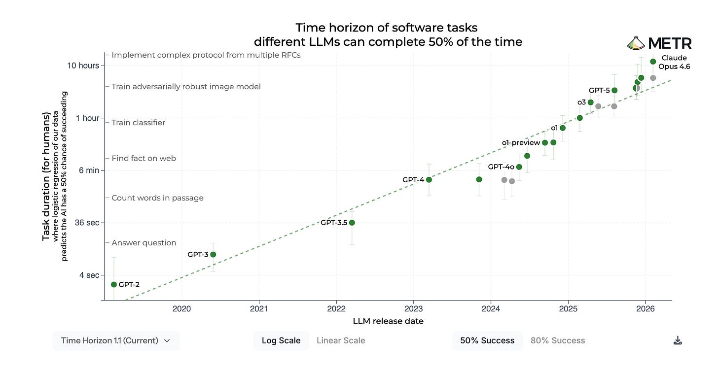 Boaz mở đầu bằng ý mà giờ gần như ít ai còn phủ nhận: năng lực của AI vẫn đang tăng rất nhanh, và xu hướng đó chưa hề có sự chậm lại, thậm chí còn tăng nhanh hơn. Ông nhắc thẳng đến “METR graph”, và đây không phải là một hình minh hoạ vu vơ. Trong nghiên cứu của METR, nhóm tác giả đề xuất đo khả năng của AI bằng “task-completion time horizon” — tức là AI có thể hoàn thành được những task mà con người thường mất rất lâu để làm. Kết quả họ công bố cho thấy mốc này đã tăng theo xu hướng gần như hàm mũ trong nhiều năm, với thời gian nhân đôi khoảng 7 tháng; trong cập nhật đầu 2026, METR nói các model mới hơn vẫn tiếp tục bám khá sát xu hướng lịch sử này.