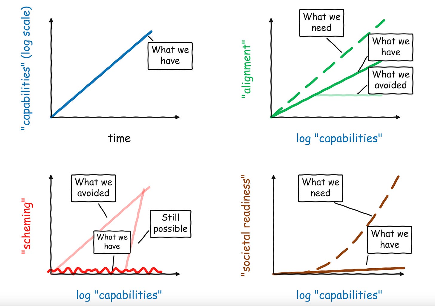 Boaz gọi đó là 4 “fake graphs” vì đây không phải chart học thuật với dataset đầy đủ, mà là 4 hình vẽ tay để tóm tắt trực giác của ông về AI safety ở đầu năm 2026. Nhưng chính vì đơn giản, nó lại chạm rất trúng vấn đề.