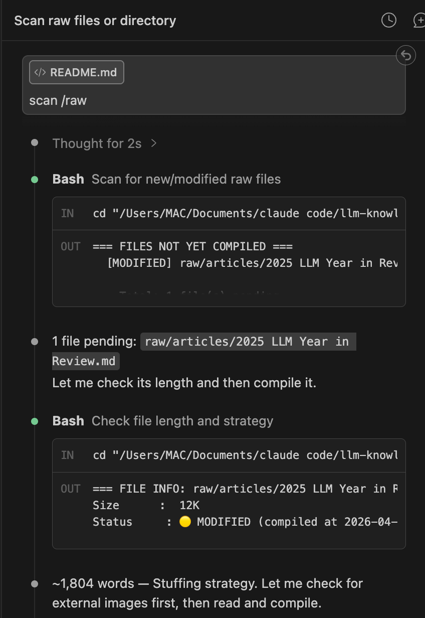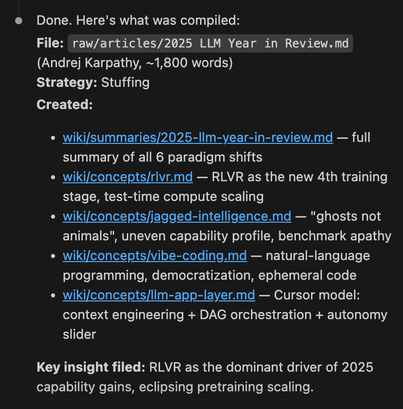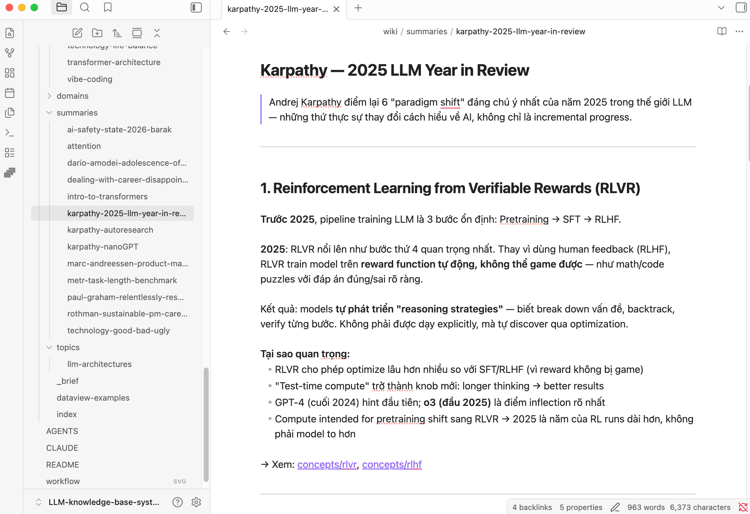 Nó tổng hợp, tự viết ra một file Concept hoàn chỉnh (có trích nguồn đàng hoàng), tự bỏ đắp vào Wiki gốc.