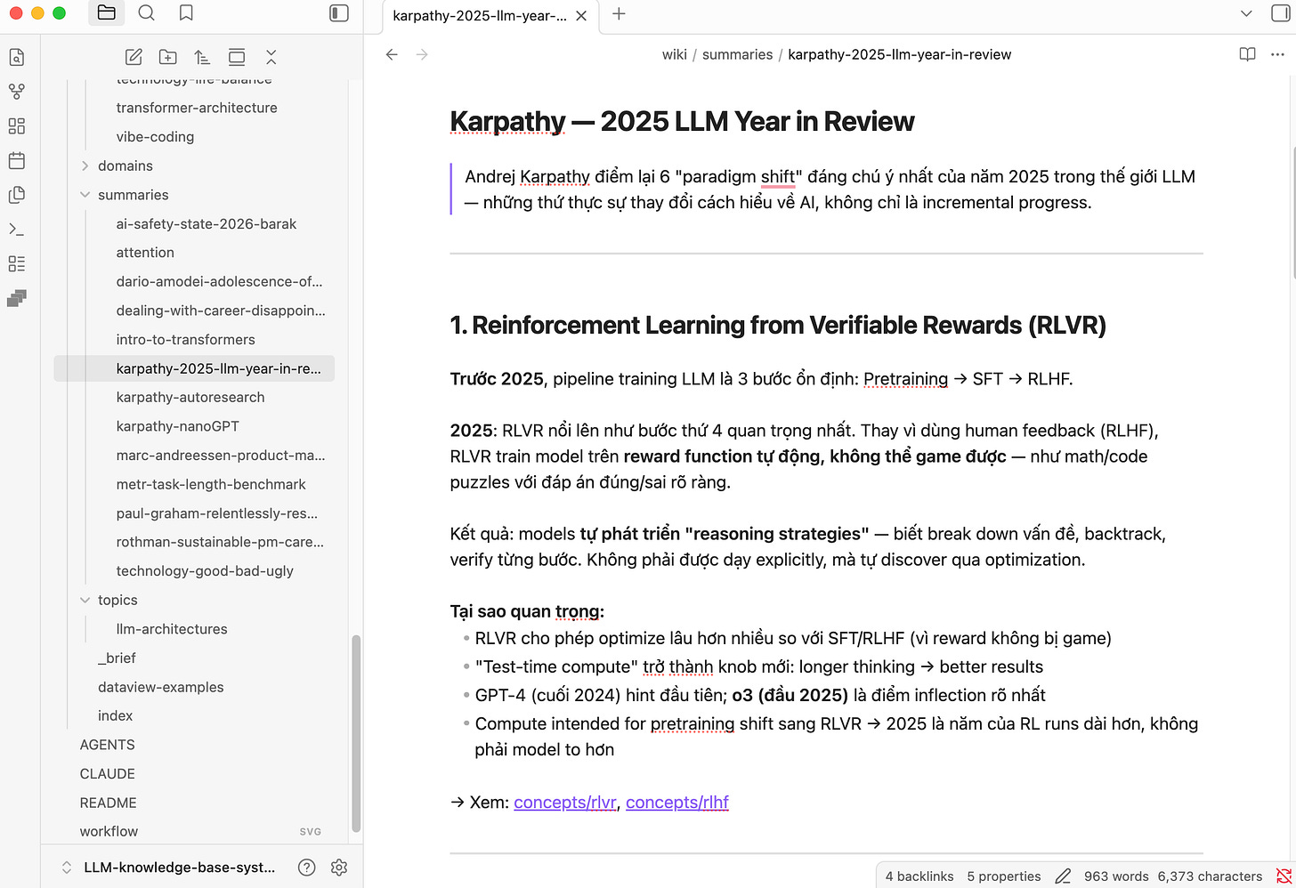 Bước “File-back” ép AI phải trích xuất những Insight mới mẻ nhất (vừa sinh ra trong quá trình so sánh) để viết NGƯỢC trở lại vào các file concept trong hệ thống ban đầu. Mỗi một câu hỏi khó bạn đặt ra cho AI, Wiki của bạn sẽ tự động dày dặn và “sáng suốt” hơn một bậc.