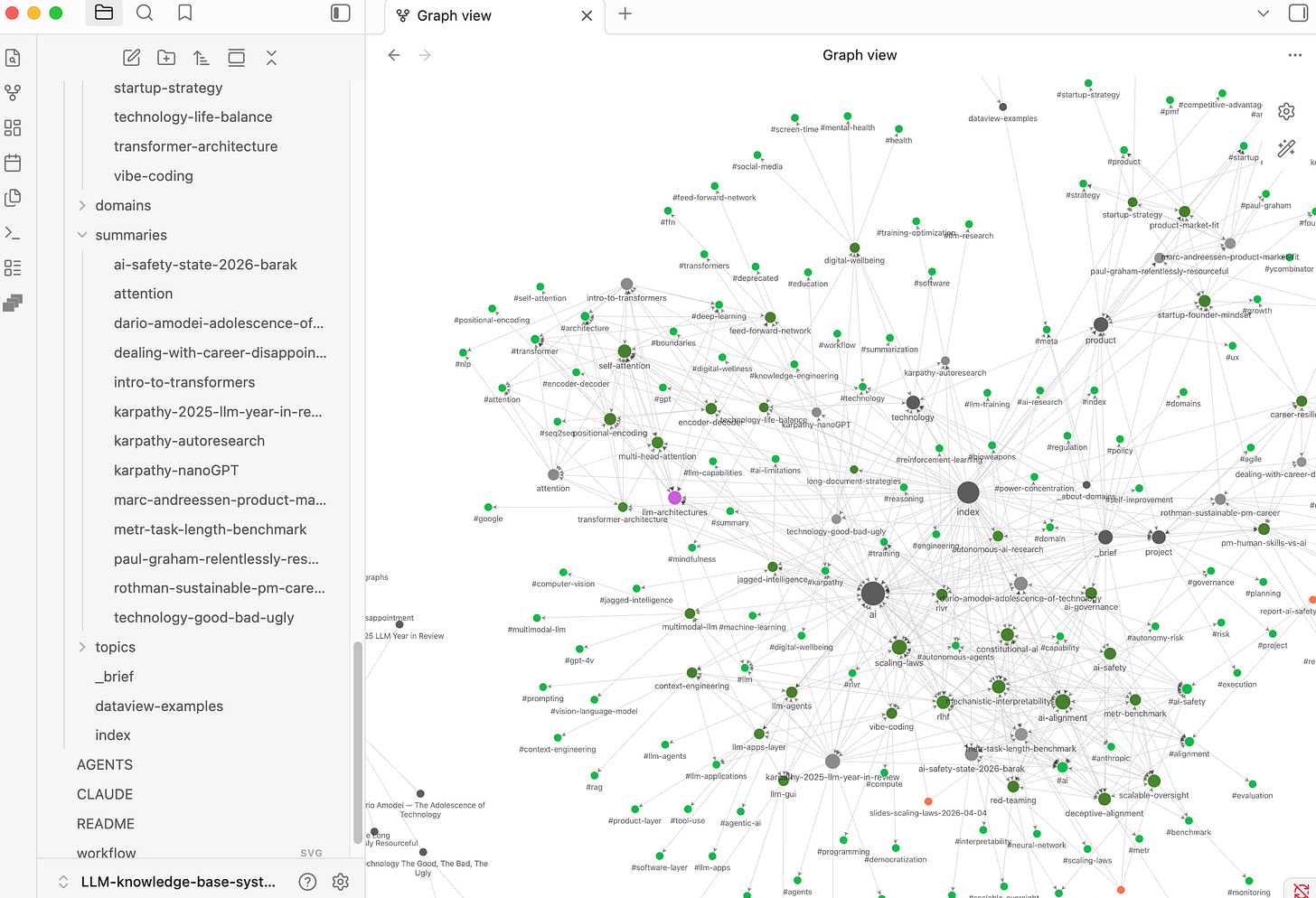 [[wikilink]]để hình thành Đồ thị Tri thức (Knowledge Graph).Query & Output (Hỏi Đáp & Trích Xuất): Bạn đặt câu hỏi phức tạp. AI quét mớ bòng bong Wiki và xuất ra các Báo cáo, Slide thuyết trình (Marp format), hoặc Vẽ biểu đồ.