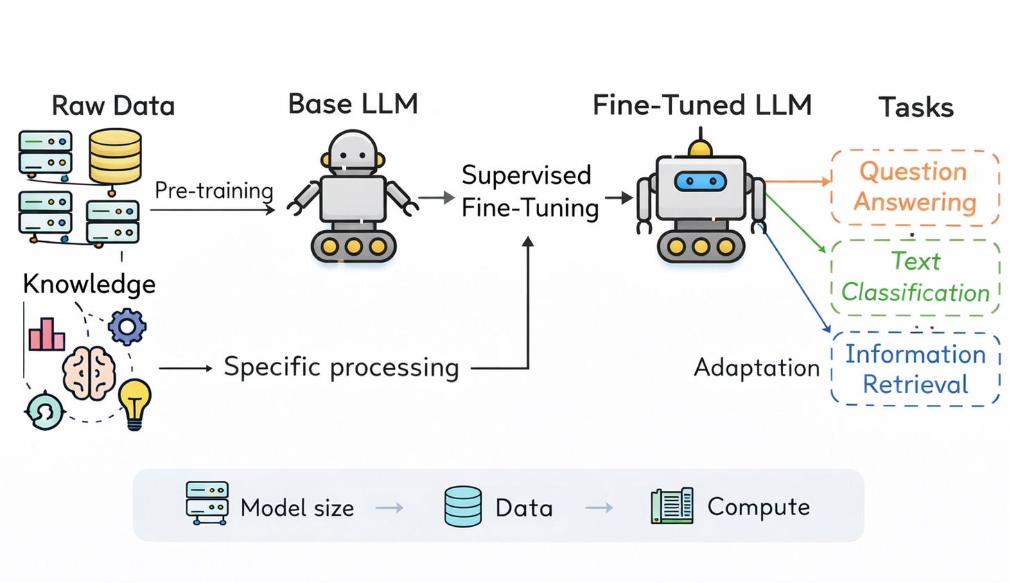 Một legal model, một coding model, một medical assistant, hay một enterprise copilot thường không được xây chỉ bằng “pretrain xong là đủ”. Chúng được định hình qua nhiều lớp post-training để phù hợp hơn với domain, hành vi người dùng và ràng buộc sản phẩm. [3]