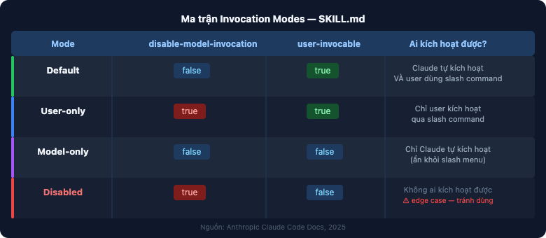 Có 2 independent toggles bạn cần nắm: disable-model-invocation và user-invocable. Kết hợp chúng tạo ra 4 modes: