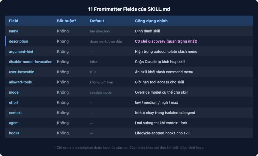 SKILL.md có 11 frontmatter fields. Chỉ 2 field ảnh hưởng đến việc skill có được phát hiện hay không. Số còn lại chỉ có tác dụng sau khi skill đã được kích hoạt rồi.