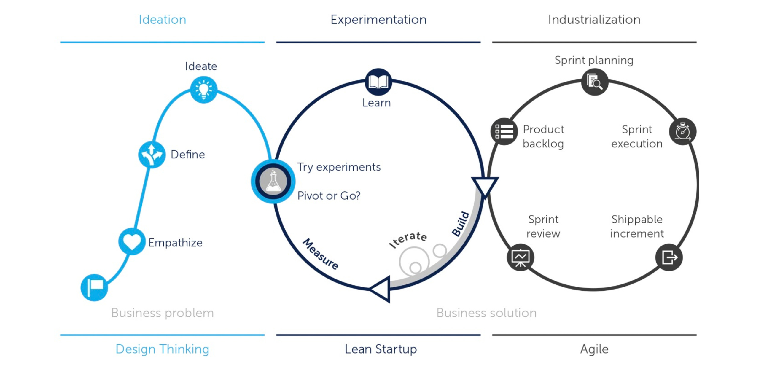 Mô hình này cho thấy rõ ràng 03 giai đoạn của quá trình tạo ra một Product từ Ideation -> Experimentation -> Development.